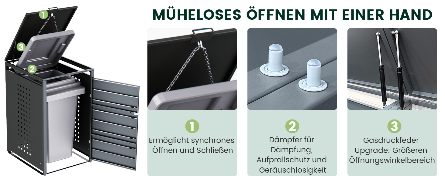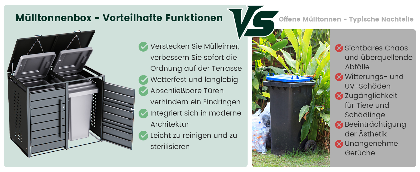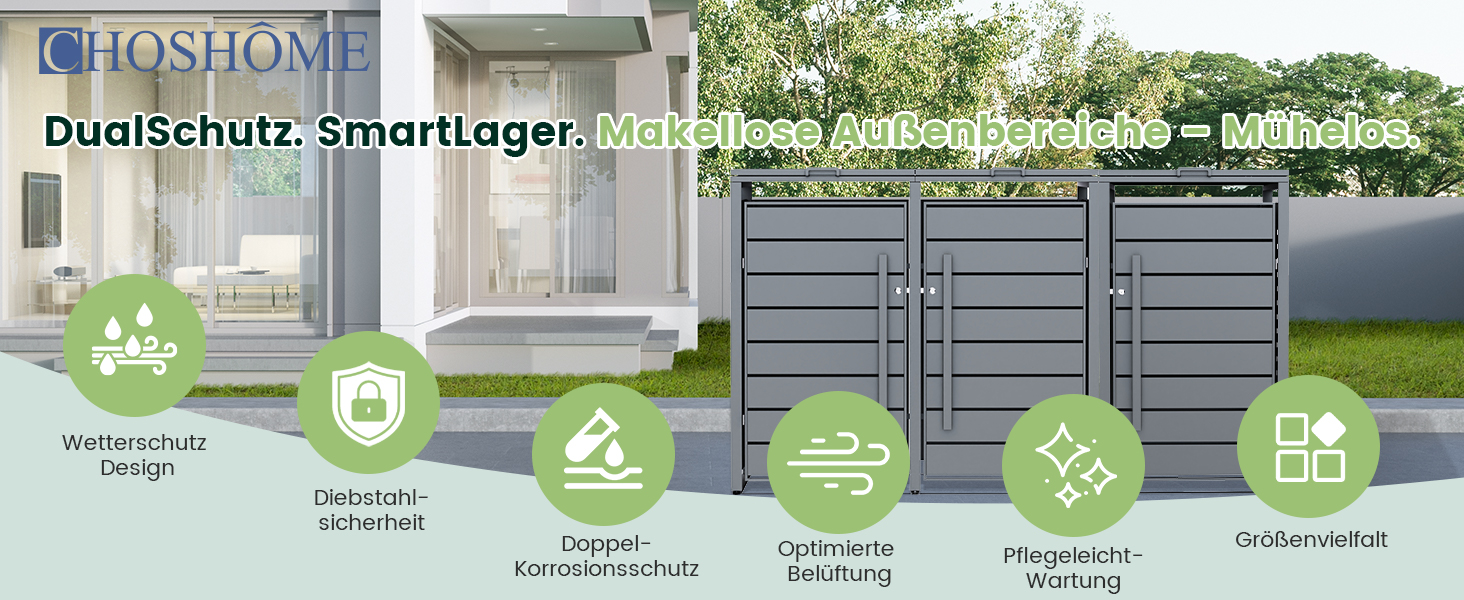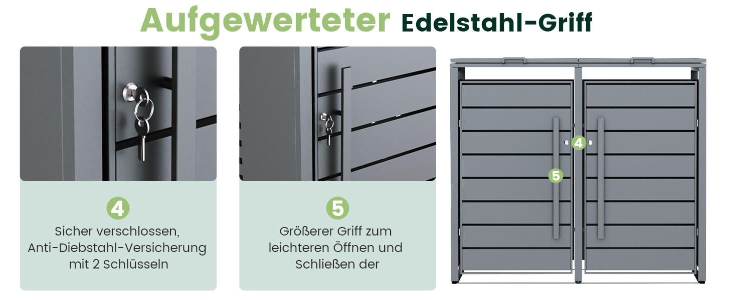 - Sicheres und Abschließbares Design: Integriertes Türschloss schützt Mülltonnen vor unbefugtem Zugriff und unerwünschten Tieren.