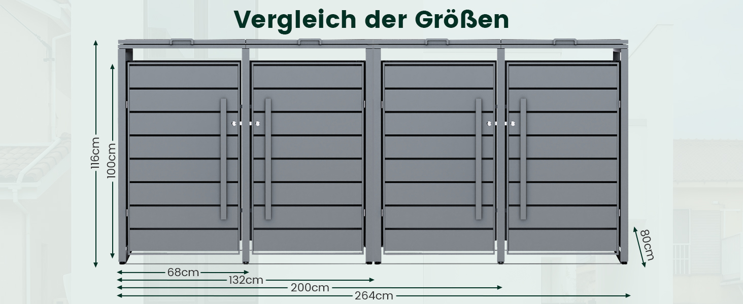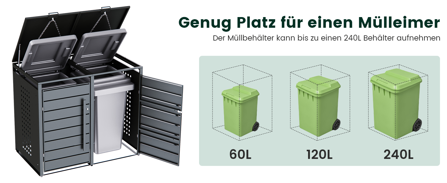 - Platz für mehrere Mülltonnen: Entworfen für bis zu vier Standard-Mülltonnen (60 L, 120 L oder 240 L) – für eine saubere Außenansicht.