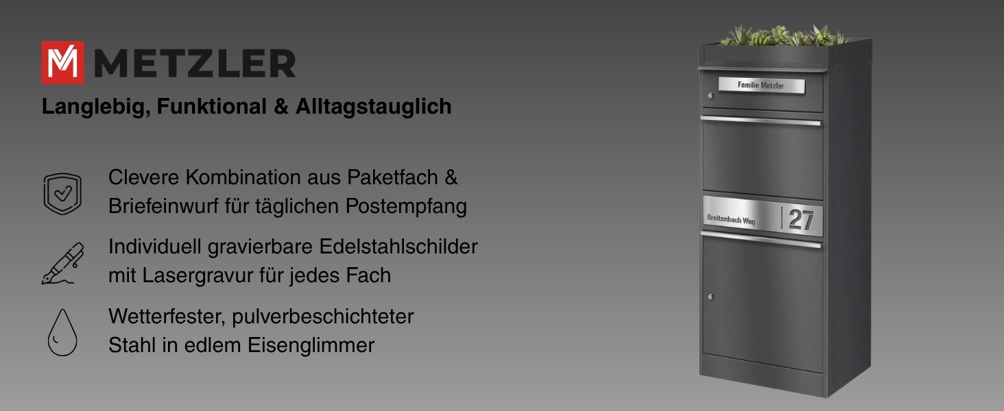 Metzler Briefkasten mit Paketfach, abschließbar, wetterfest und personalisierbar – ideal für Garten und Eingangsbereich