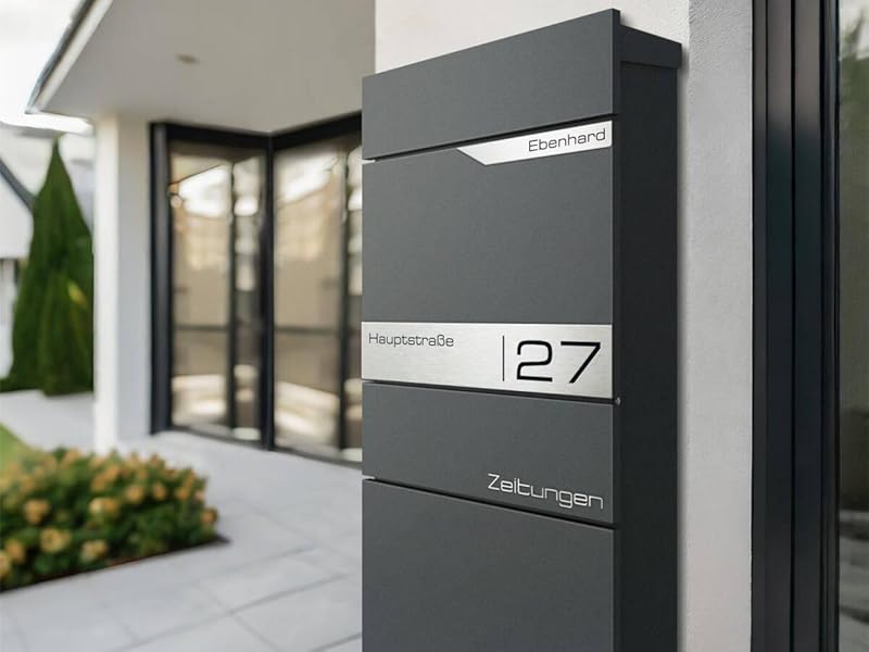 Ein besonderes Highlight dieses Briefkastens sind die integrierten Gravurleisten aus rostfreiem Edelstahl. Hier haben Sie die Möglichkeit, Ihren Namen, die Hausnummer und den Straßennamen individuell zu gestalten. Diese personalisierte Note verleiht Ihrem Briefkasten einen einzigartigen Charakter. Zudem ist die Gravur „Zeitungen“ im Zeitungsfach bereits in der ansprechenden Schriftart 7 vorgraviert, was die Nutzung zusätzlich vereinfacht.